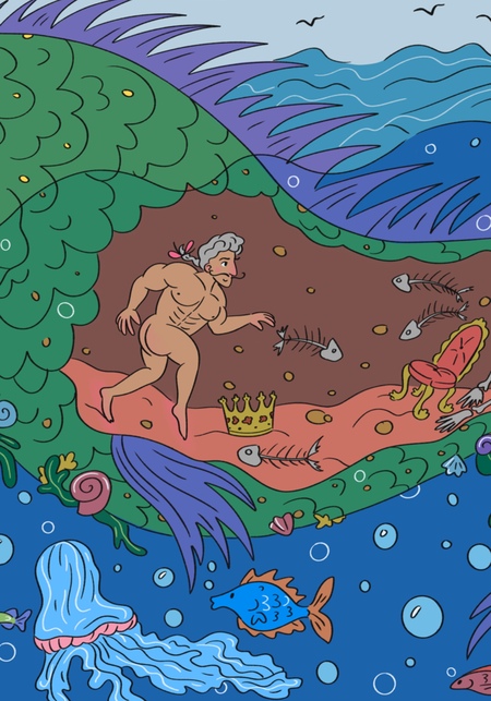Для иллюстрирования я выбрала один из рассказов Рудольфа Эриха Распе о приключениях барона Мюнхгаузена «В желудке у рыбы» и адаптировала его под 4 разворота. В процессе создания комикса я разработала дизайн персонажа, а также сами развороты с иллюстрациями и текстом.