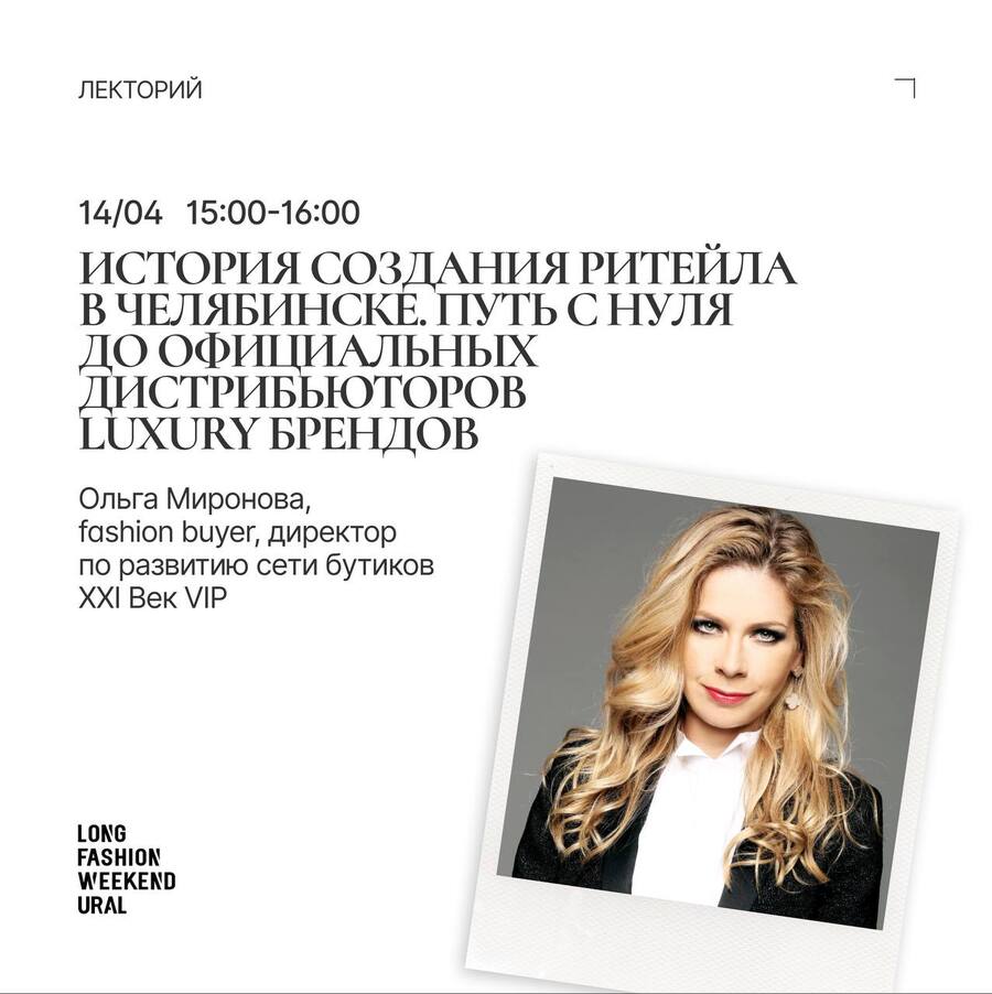 — «История создания ритейла в Челябинске. Путь с нуля до официальных дистрибьюторов luxury брендов» Ольга Миронова, fashion buyer, директор по развитию сети бутиков XXI Век VIP