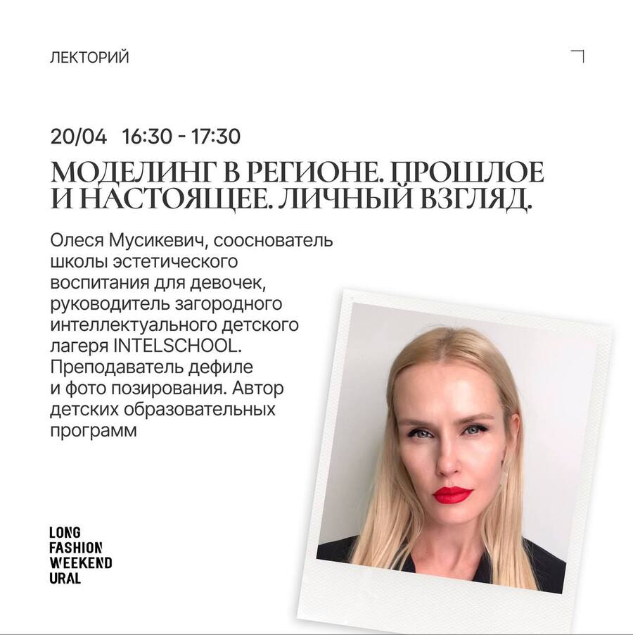 - Моделинг в регионе. Прошлое и настоящее. Личный взгляд. Олеся Мусикевич, сооснователь школы эстетического воспитания для девочек, руководитель загородного интеллектуального детского лагеря INTELSCHOOL. Преподаватель дефиле и фото позирования. Автор детских образовательных программ.