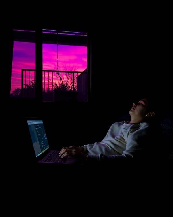 Student in front of a laptop sitting in a dark room with purple sunset in the window