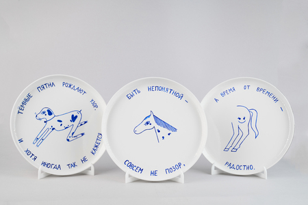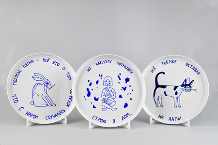 Серия расписанных фарфоровых тарелок, иллюстрирующих детское стихотворение авторства художницы. Книжка-картинка из тарелок, повествующая о ценности любого, даже негативного, жизненного опыта.