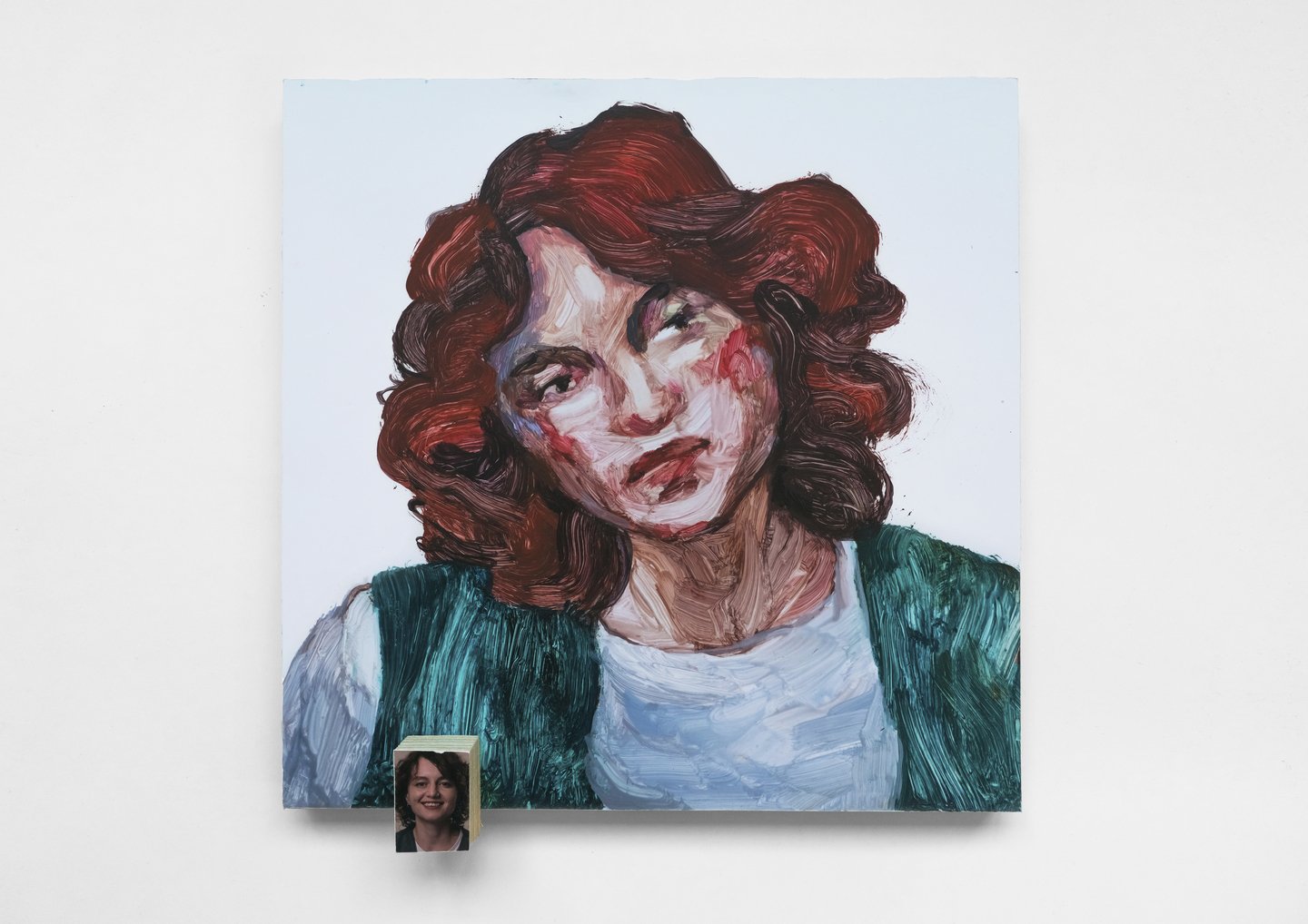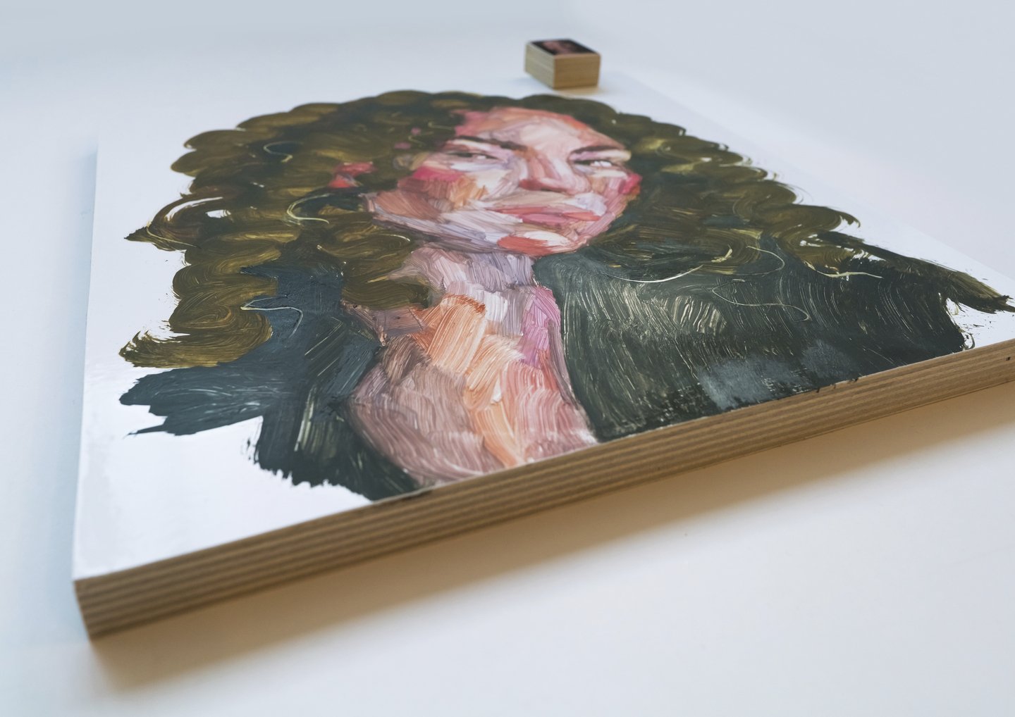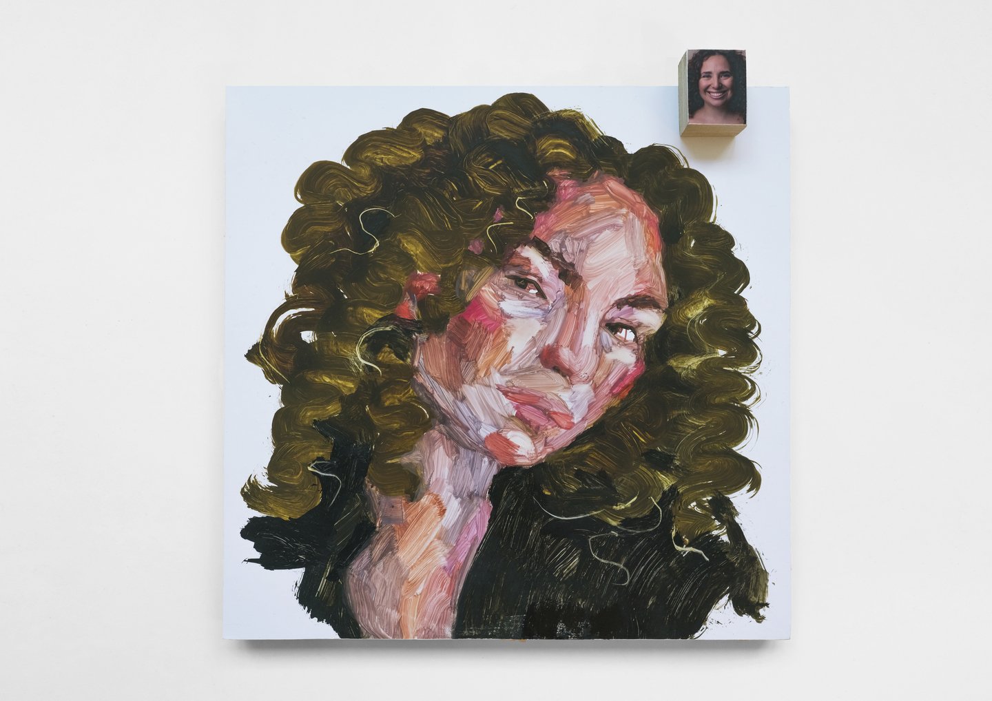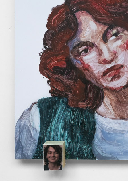 Серия фотографий — это живописные портреты героинь из видео, сопоставленные с их фотопортретами. В живописи я уделяю внимание деталям, передаче индивидуальных черт и настроения, стараюсь уловить характер героини. Фотографии же фиксируют момент улыбки «на заказ» из видео, они напечатаны в формальном стандартном размере документа 3×4 см. Я сталкиваю индивидуальность и выражение внешних запросов к мимике.