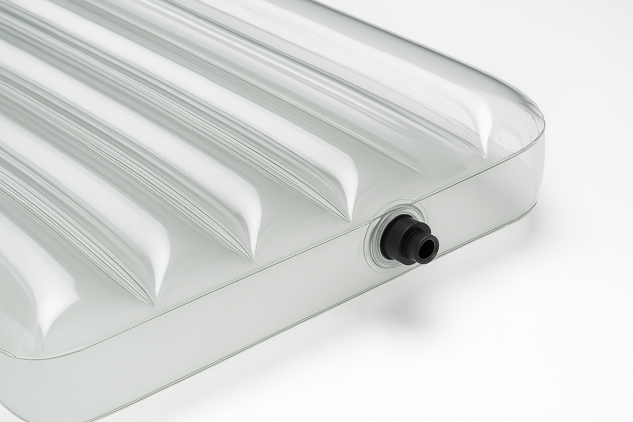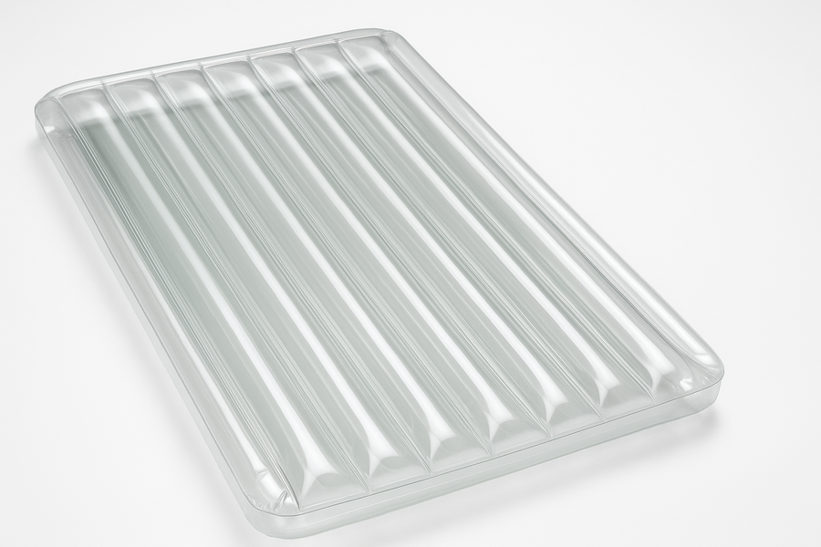 Матрас выполнен из прозрачного поливинилхлорида. Он легко подстраивается под любой рельеф, выглядит стильно в любой точке мира.