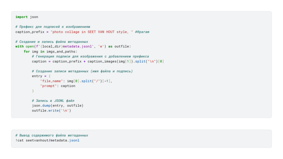 The BLIP model was used to generate image signatures. I’ve performed a function that creates a description for each image based on a prefix set in the SEET VAN HOUT style. The results were kept in the JSONL format. After the generation, I cleaned up the memory, removed the model, called the garbage collector, and set up the loch to avoid mistakes.