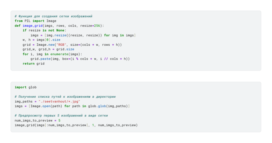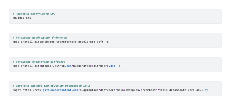 At the beginning, I checked the availability of the GPU and installed the following libraries: bitsandbytes, transformers, accelerate, peft, and the current version of the diffusers. A script was also downloaded to teach DreamBooth with LoRA. After setting the environment, I created a directory for images and copied data to it. For a quick download check, a collage image function was written, and then I checked the first examples.