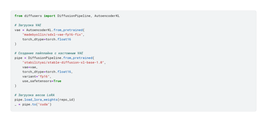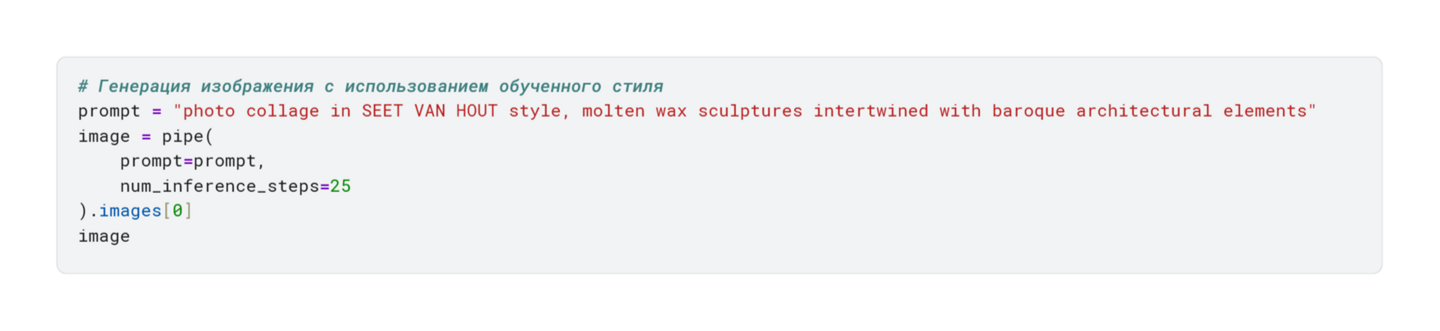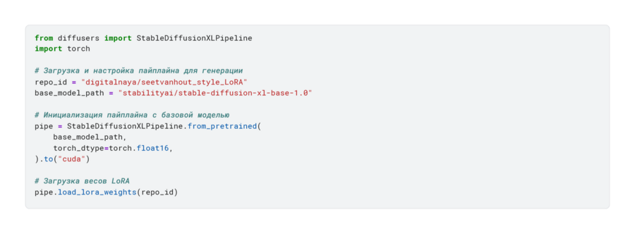 In the final stage, I downloaded the Stable Diffuse XL webline, hooked it up with trained weights and a caste VAE. Then new images were generated using pre-formulated text requests in the artist ' s style. Each generation was executed with a number of diffusion steps equal to 25, which ensured the necessary detail. The whole process — from the production of images and the generation of descriptions to model training, publication and new images — has been successfully implemented.