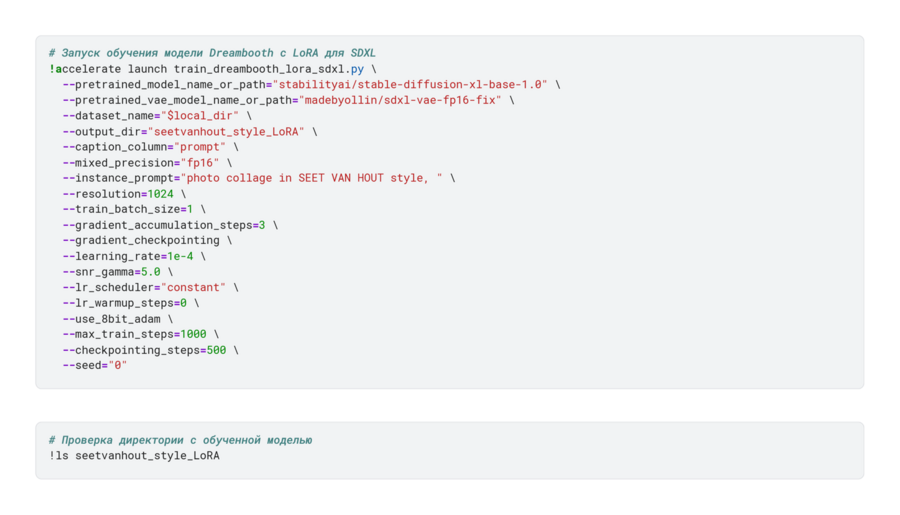 After the data was prepared, I was approved to Hugging Face Hub and installed a dataset library. Then I started the process of re-education of the DreamBooth model using the LoRA. The training parameters included a basic model, a path to VAE, a directory with drawings, instance prompt, resolution, boot size, number of steps, sceduler and seed value. The training was conducted over a period of 1,000 steps and the intermediate results were maintained at 500 steps.
