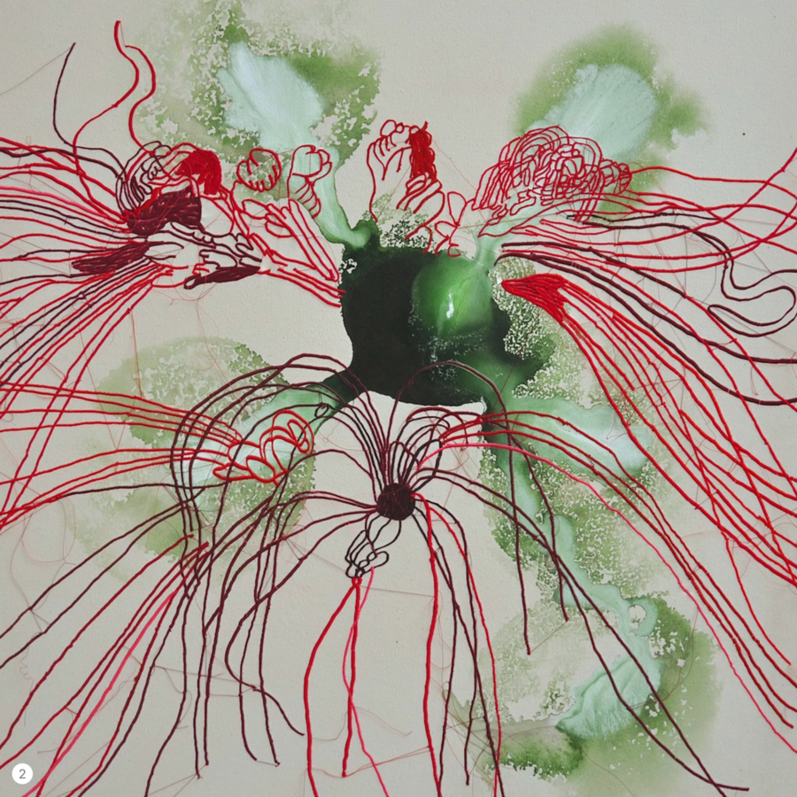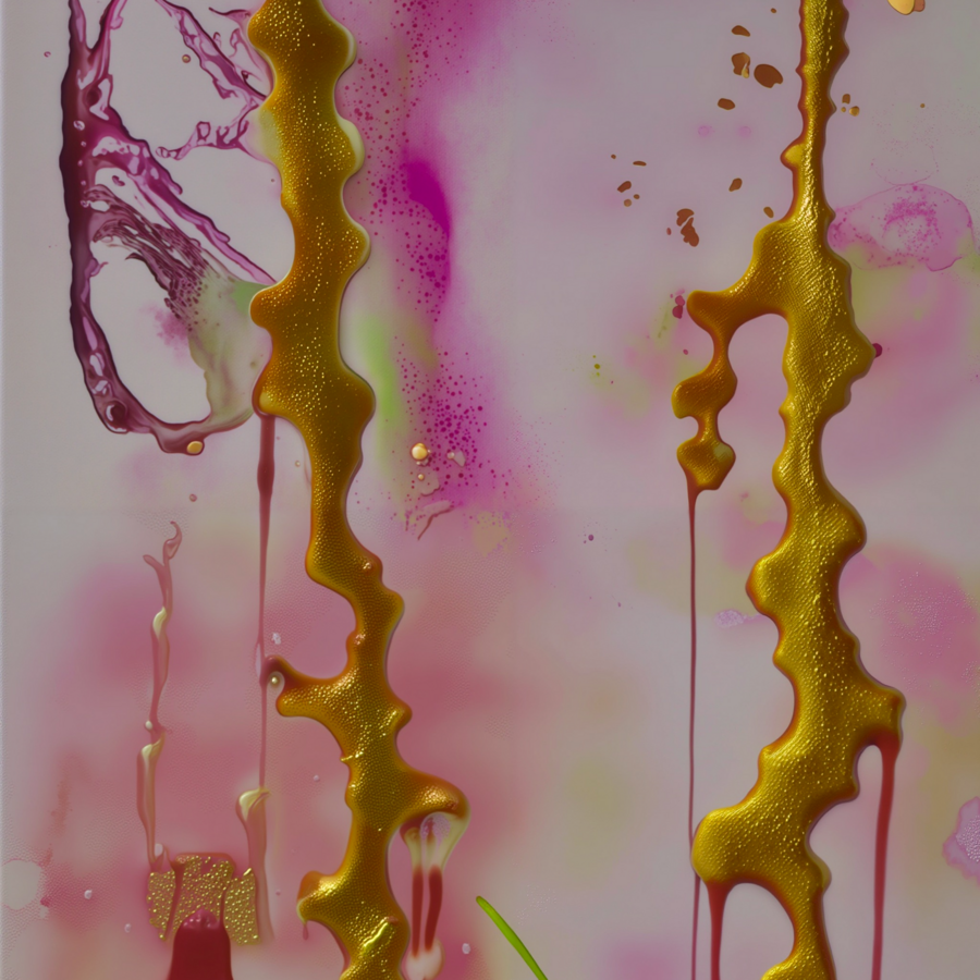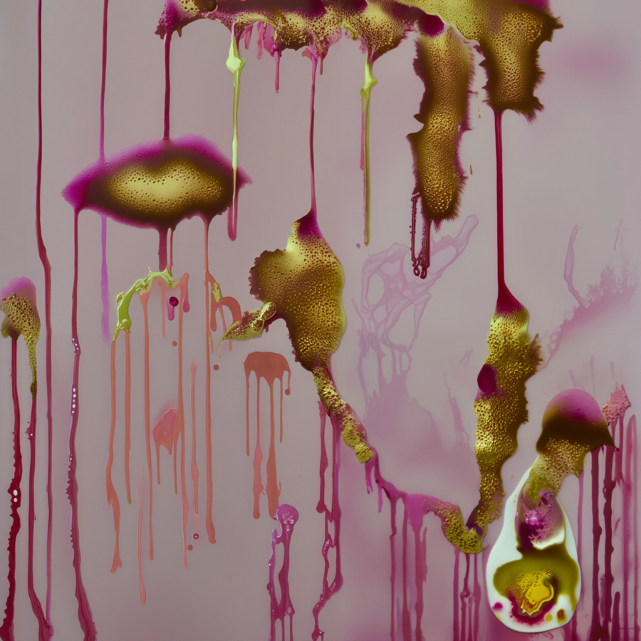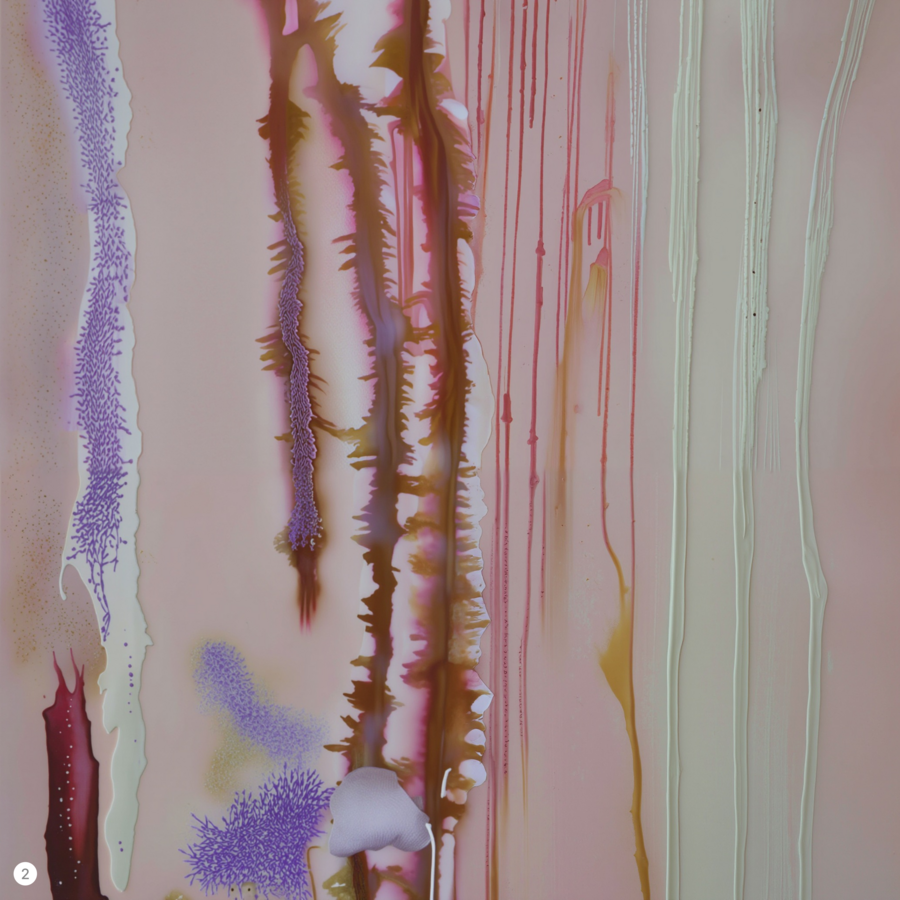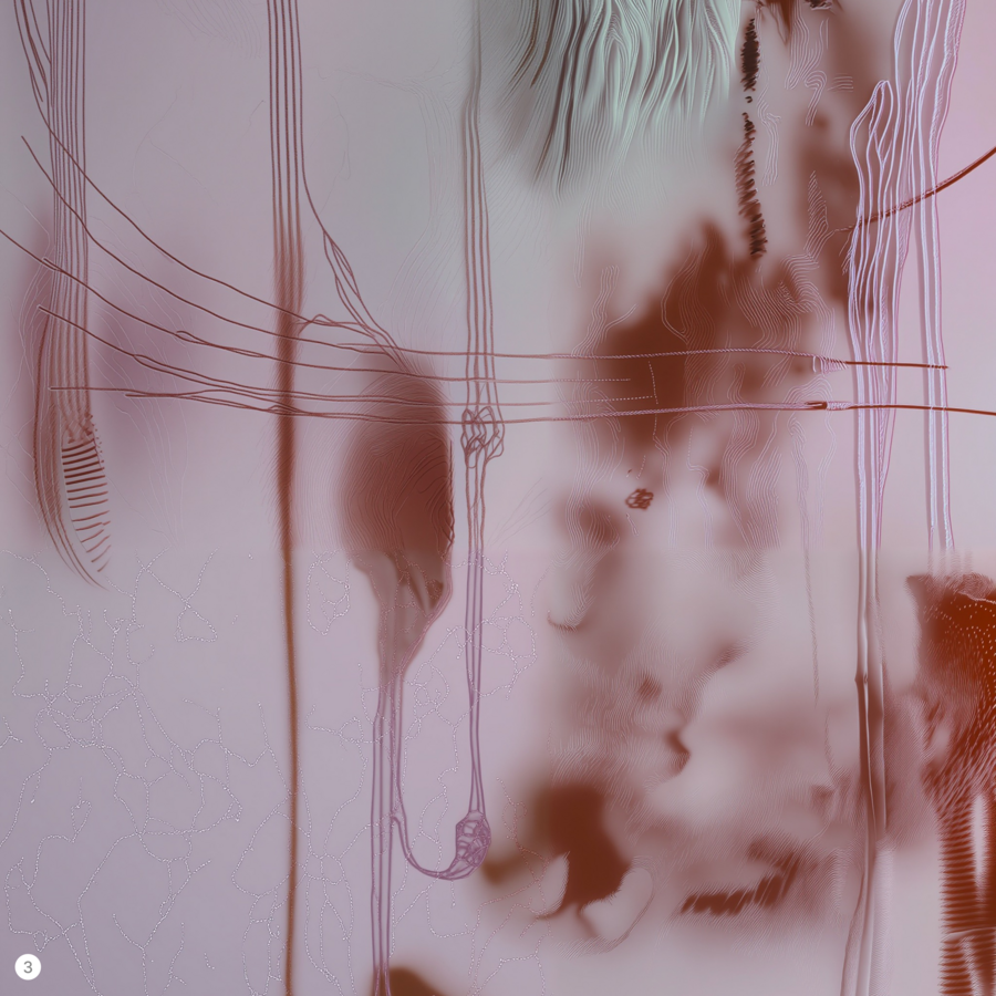 1. »…a garden of stockers with watercolor numbers» (2) 2. »…a paintbrush dripping that turn into Tiny Birds» The series produced includes images as if they were coated from current structures, branched vascular lines, growing masses. Such motives refer to anatomical cuts, root systems, tissue structures. In some images, shape flows down or curls through the center, and in others, as if floating on the surface. Sit’s visual sense of organics is repeated, as if the material was moving, decaying, or confluenced. Reproduction of free-flowing and paint-washing techniques. For example, the pigment spreads through the background, forming soft, organic contours that resemble spots on biological tissues. Visually, the effect of approaching painting with acryl and watermelon on wet paper. Digital drops vary in density and flow along gravitational lines. The focus is on the transmission of uncontrollable material, which intersects with the original artist’s technique.