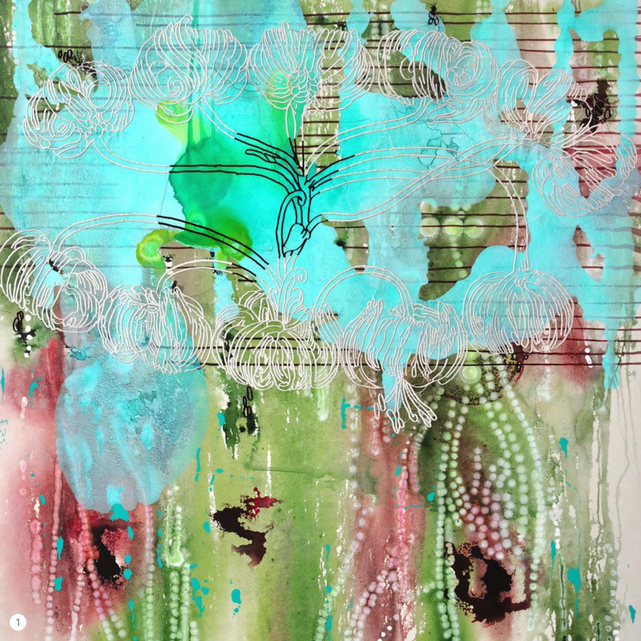 1. »…a topographical map extruded into three-dimensional ribbons of vellum, floating over volcanic eruptions of gouache and spray paint» 2. »…a tsunami frozen mid-crash into geometric shards of frosted glass and fishing net fragments»