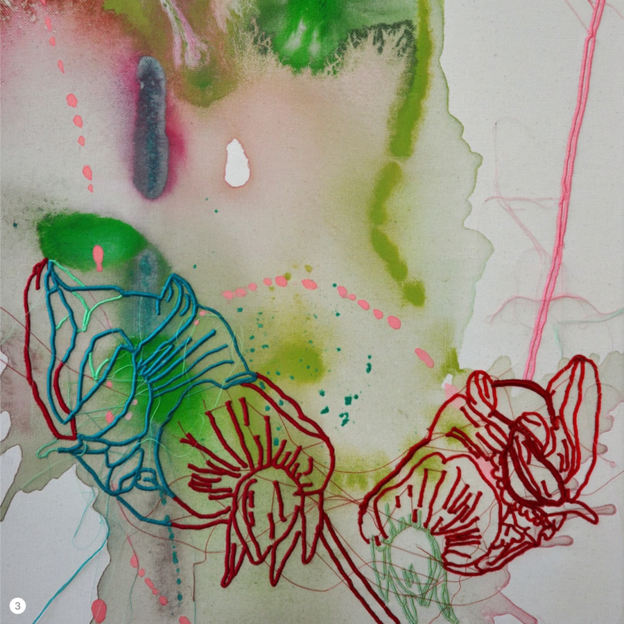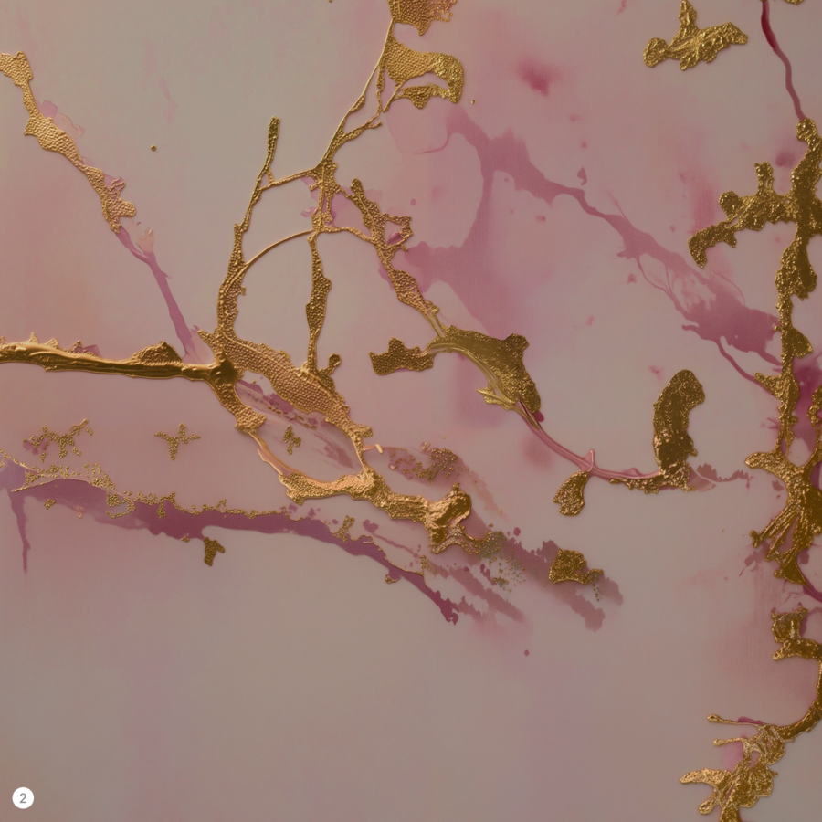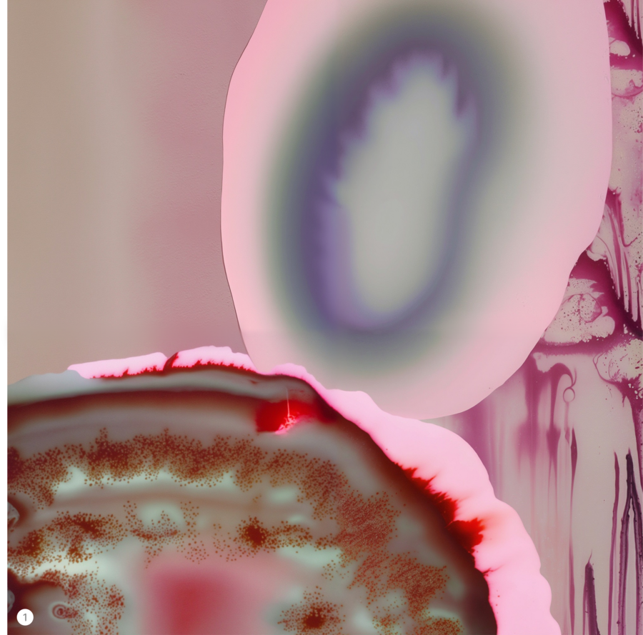 1. »…geometric diamonds with razor-sharp edges floating against a chaotic splash of liquid gold and cruched berries, each line drawn with 0.3 mm technical pen precision» 2. »…organic forms and layered texts» 3. »…surgical-precise Line drawings of botanical specifics dissected by vivalent activities of acrylic paint in industrial yellows and warning-sign reds» Corporal, pink, beard, gray, ash, milk tones prevail. There are dense colour spots and leaks, active accents, and muffled crossings. Coaches are soft, color functions as an element of the body structure. The light on the images is weak, scattered, deep.