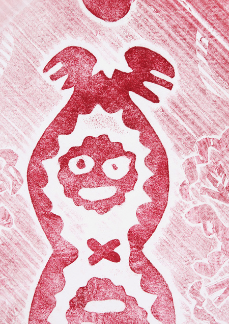 В серии печатной графики «Тихий час» я исследую феномен парейдолии, связанный с коллективной детской привычкой вглядываться в бесконечно огромные ковры и одеяла и находить в их узорах страшные лица. Гравюры напечатаны на ткани и вшиты внутрь пододельников на место ромбов — мифических элементов из детства, в которые с легкостью можно было провалиться.