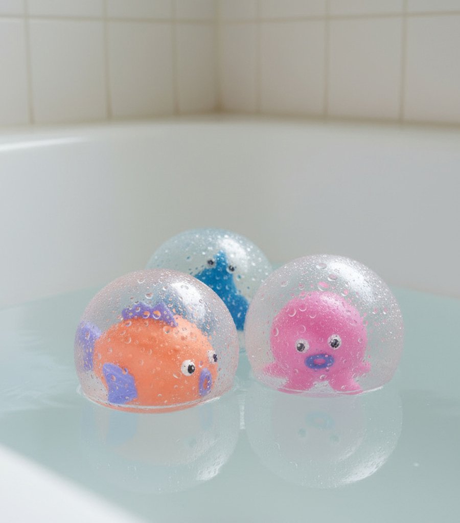 В базовом состоянии игрушки не привлекают много внимания, но при соприкосновении с водой проявляется скелет рыб и яркие цвета. Такие шарики с игрушками внутри смогут добавить интерактива в процесс принятия ванны, а так же могут стать первым изучением детей морской флоры и фауны.
