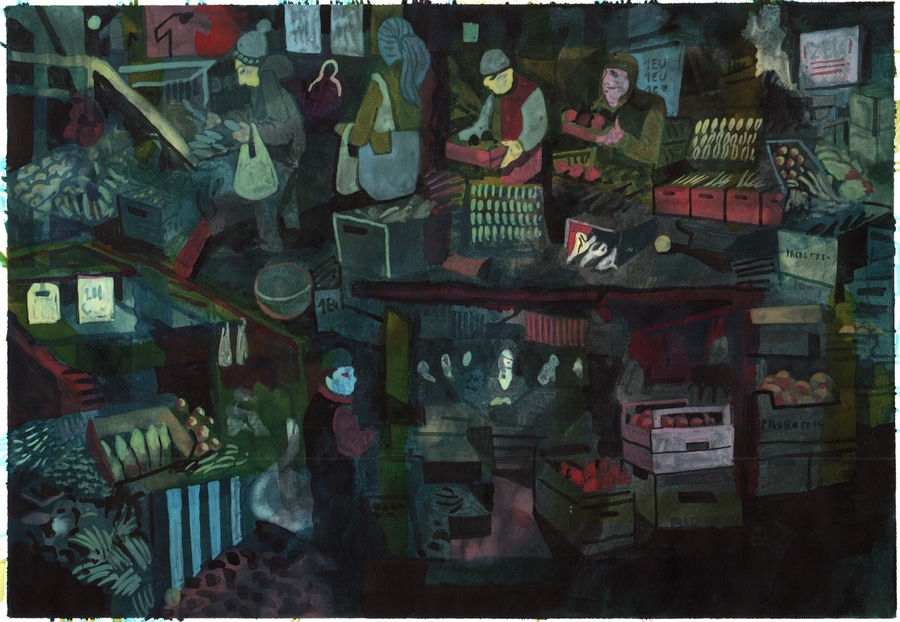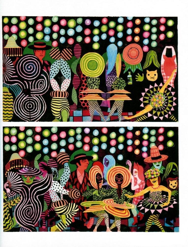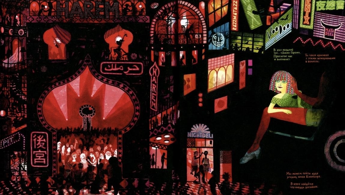 Художник создает свой особый мир, полный различных красок. Брехт Эвенс замечательно передает всю стихийность этой ночи. Геометрические формы, такой насыщенный колорит каждой страницы, некоторое свечение, все это смешивается в одно на страницах этого комикса. Своей артхаусной манерой транслировать происходящее, Брехт Эвенс отлично передает все события этой ночи: спонтанность и некоторое наслаждение. Герои сталкиваются с различными событиями, но везде их преследует характерные контрастные цвета и различные геометрические формы. Особенно это прослеживается в начале работы, где почти каждая картинка заполнена целиком.