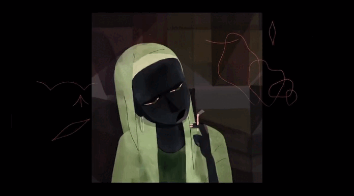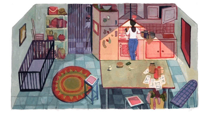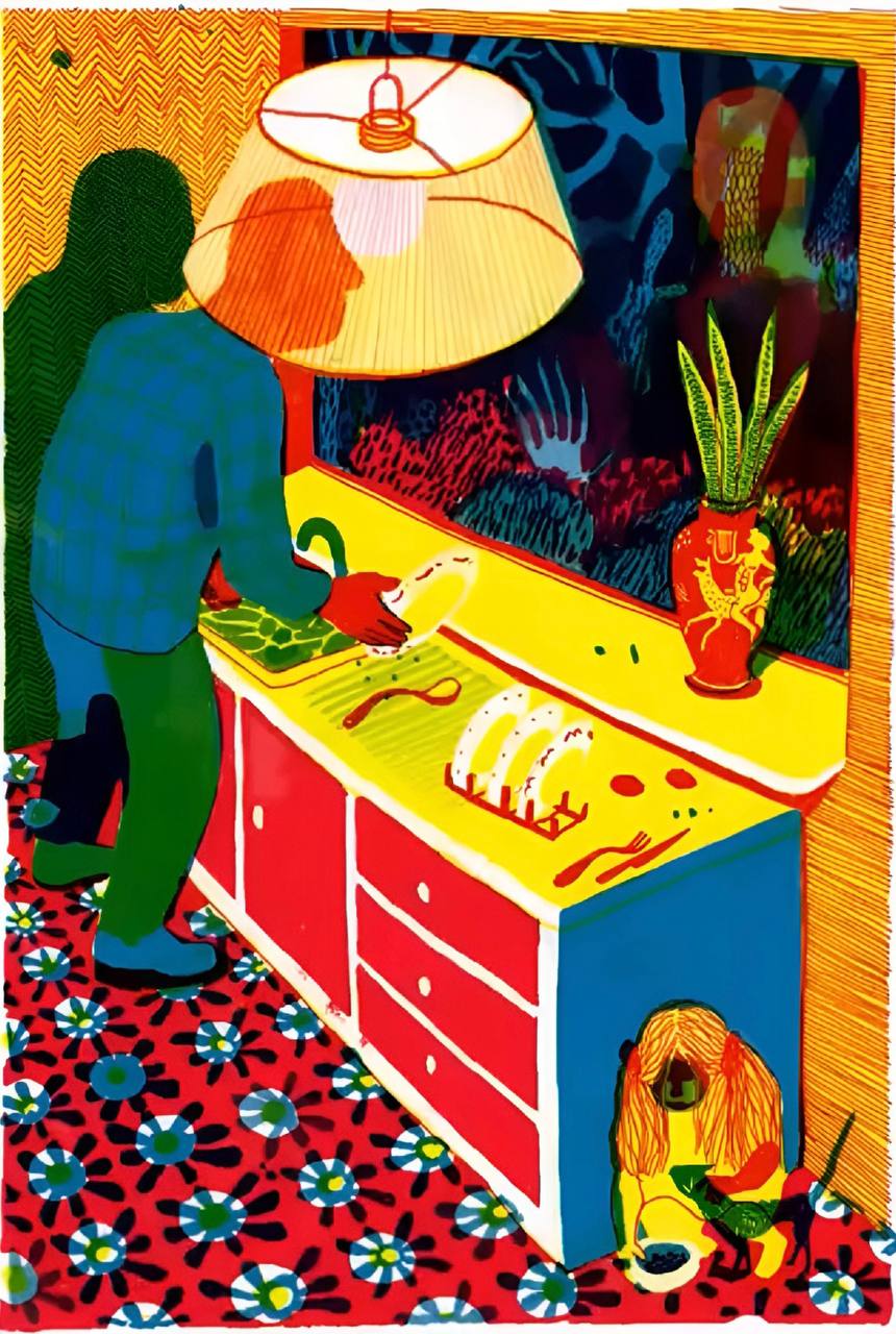 Брехт Эвенс выступал и мультипликатором короткометражного фильма «Гений места», номинированного на Оскар. В кадрах, представленных ниже, отлично считывается стиль Брехта Эвенса: типичная для него композиция комнаты, колористическое решение, наложение цветовых пятен друг на друга для создания объемного эффекта.