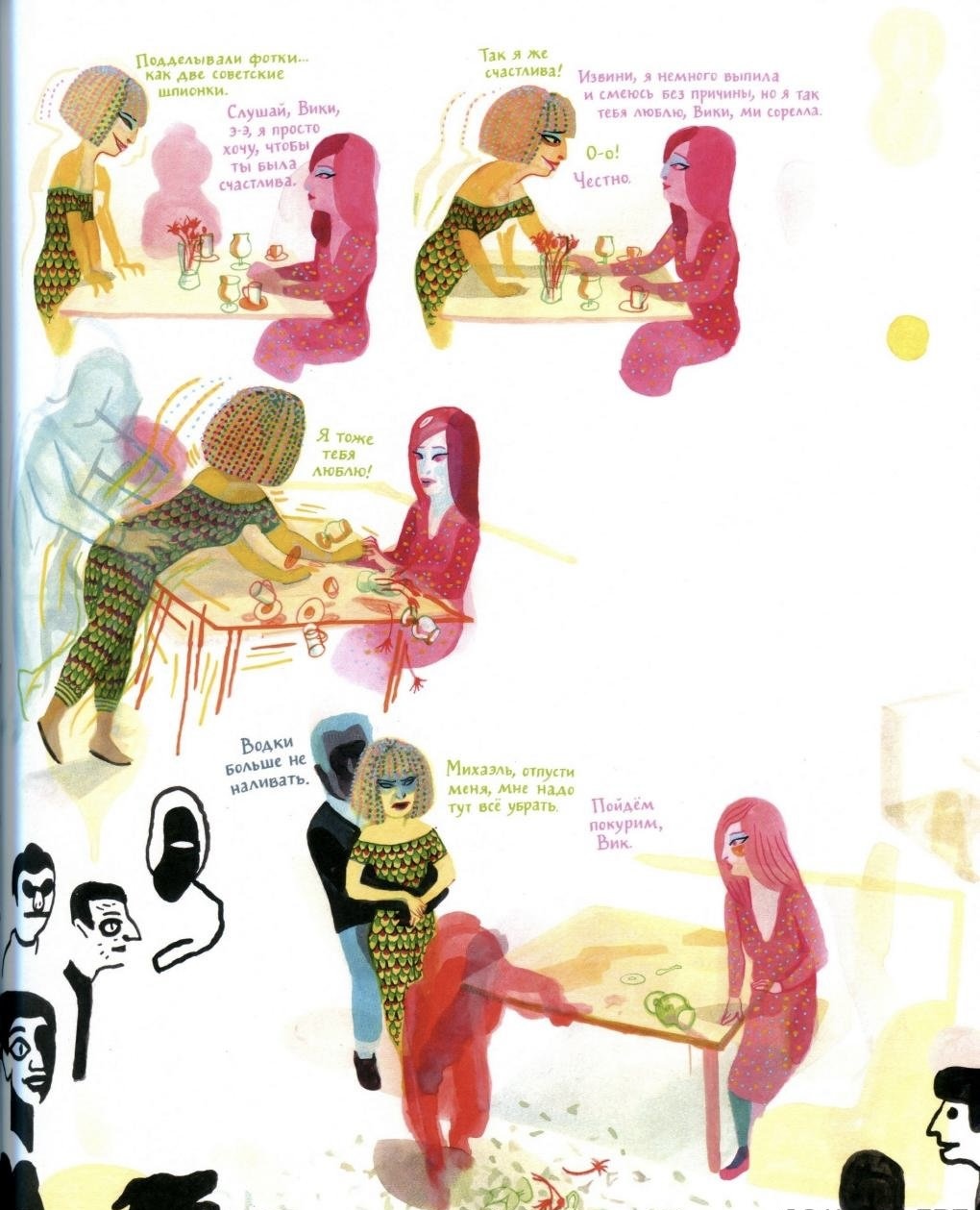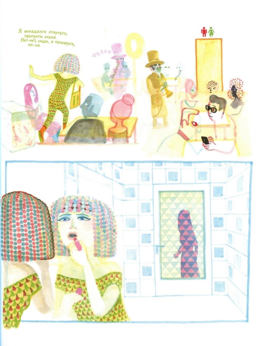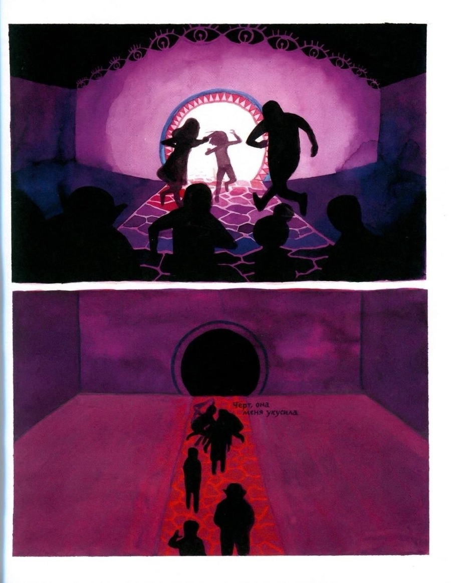 Есть ощущение, что и сама книга врет, играет с нами. Такое возможно передать лишь в комиксе. Например, сам формат книги горизонтальный, он отсылает читателя к образу классического детского альбома, завлекая нас еще и своим ярким колоритом, но в дальнейшем мы понимаем, что это далеко не добрая детская история.
