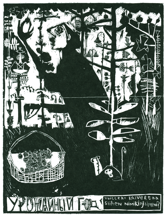 Линогравюра «Урожайный год» интересна тем, что часть светлого пятна очень сильно заполнена мелкими деталями, что привлекает внимание зрителя. В этой линогравюре меня также заинтересовал контраст между двумя частями — детализированным светлым пятном и темным пятном снизу полотна, мне кажется, что работа выглядит очень гармоничной благодаря равным количествам таких акцентов.