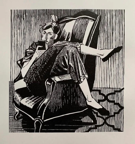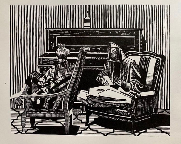 В этих двух работах мне очень нравится как Иван использует большое количество разной мелкой штриховки, но при этом линогравюры остаются живыми, не выглядят перегруженными, очень здорово, что они идут по форме объектов, поэтому композиция выглядит так гармонично. Также меня очень привлекли падающие тени от кресел, мне нравится это соприкосновение глухого темного пятна с орнаментом на полу, выглядит очень естественно.