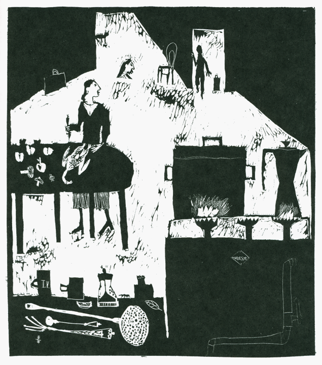 В работах Ирины Геннадиевны Васильевой мне очень нравится, как она использует контрформу, тем самым подсвечивает помещение. Например, в работе с кухней этот прием заметен лучше всего. Интересное решение не до конца прорезать белые места, а оставлять некоторые темные пятна, мне кажется, что это делает картинку более живой. Также очень нравится, как в этой работе художница изображает огонь, используя тонкие и быстрые царапинки.