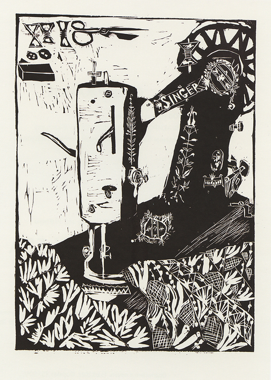 В работе «Швейная машинка» мне очень нравится сочетание орнаментов, которые использует авторка, очень необычно выглядит ткань в печатной графике. Также в работе меня привлекло гармоничное сочетание световых и теневых пятен.